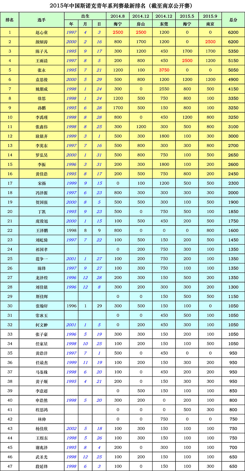 2015年中国斯诺克青年系列赛最新排名(截至南京公开赛)
